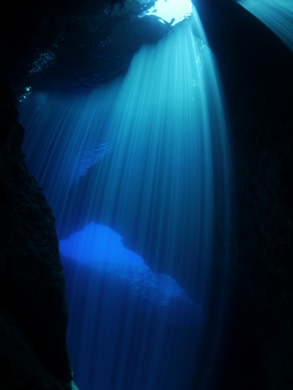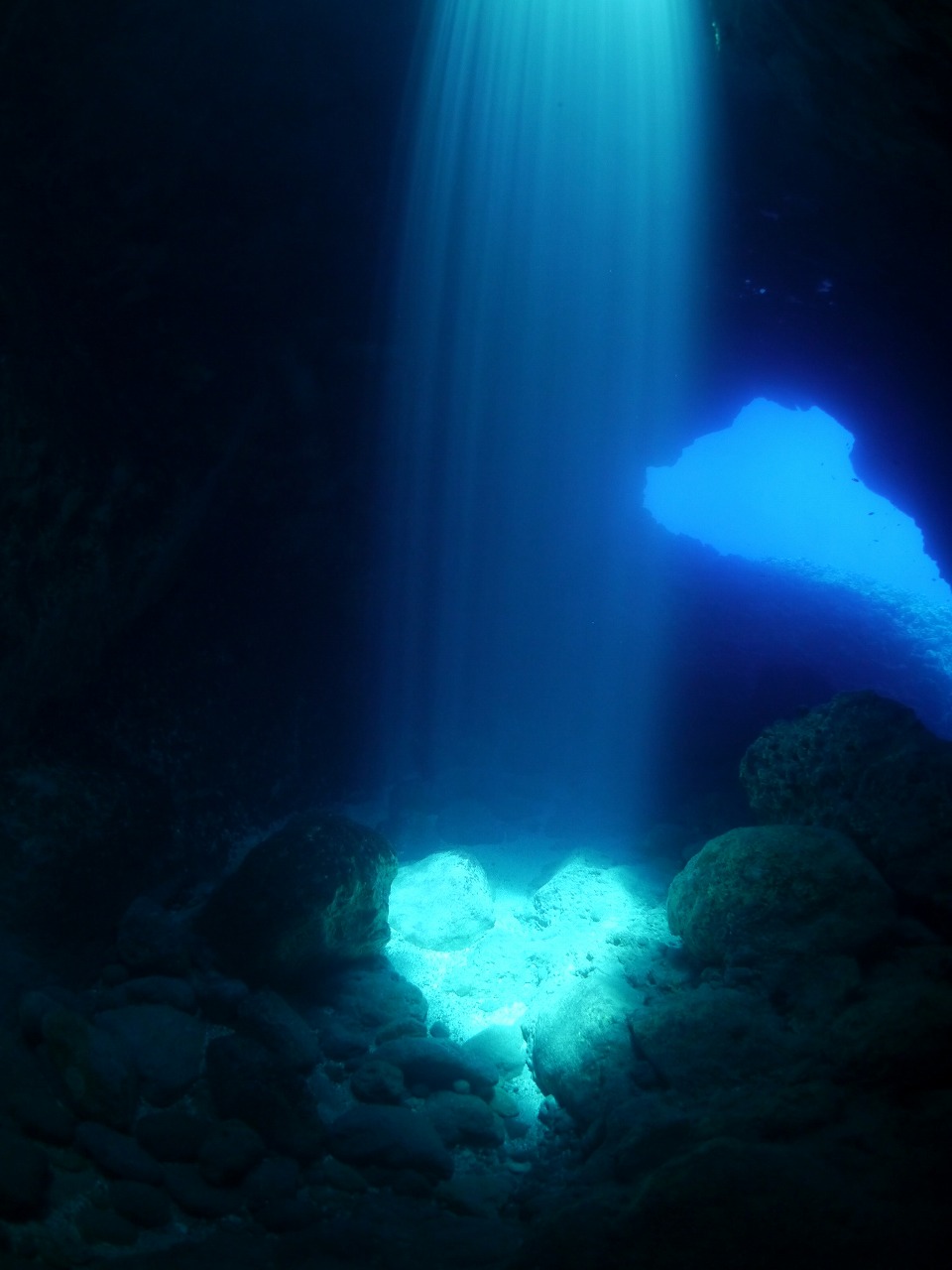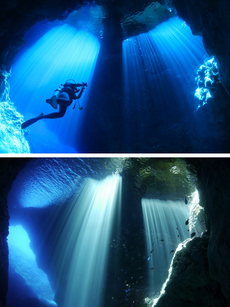 天から降り注ぐ神秘的な光の柱は、時間とともに変化していき、時にはカーテンのように広がって見えたり、放射線のように見えたりと様々な表情を楽しめます。洞窟の奥には、アカマツカサやリュウキュウハタンポなどが生息。洞窟の外にはミクロネシアの固有種の小物が多く、運がよければナポレオン等の大物にも遭遇することも。