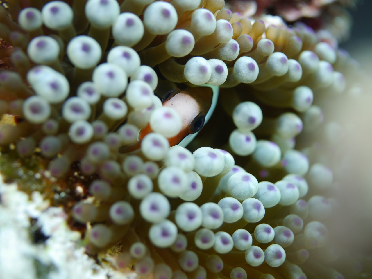 ミニ洞窟を抜けるとそこには、別世界にいるようなサンゴの園にアネモネのコロニーがある。